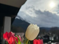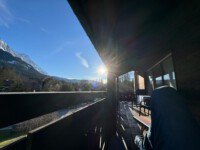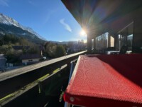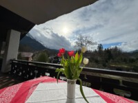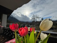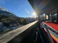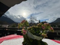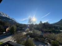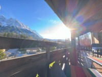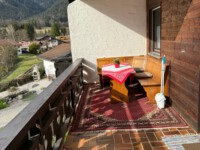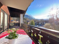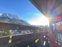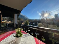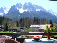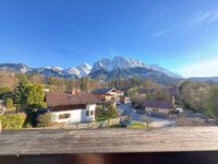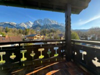 Süd- und Westbalkon ca 28 qm mit Balkonmöbel und eine Eckbank für gemütliche Stunden und Erholung. Ein herrlichem Blick auf das Zugspitz- und Waxensteinmassiv. Sie können den kompletten Tag der Sonne bzw dem Schatten folgen , einfach wunderbar